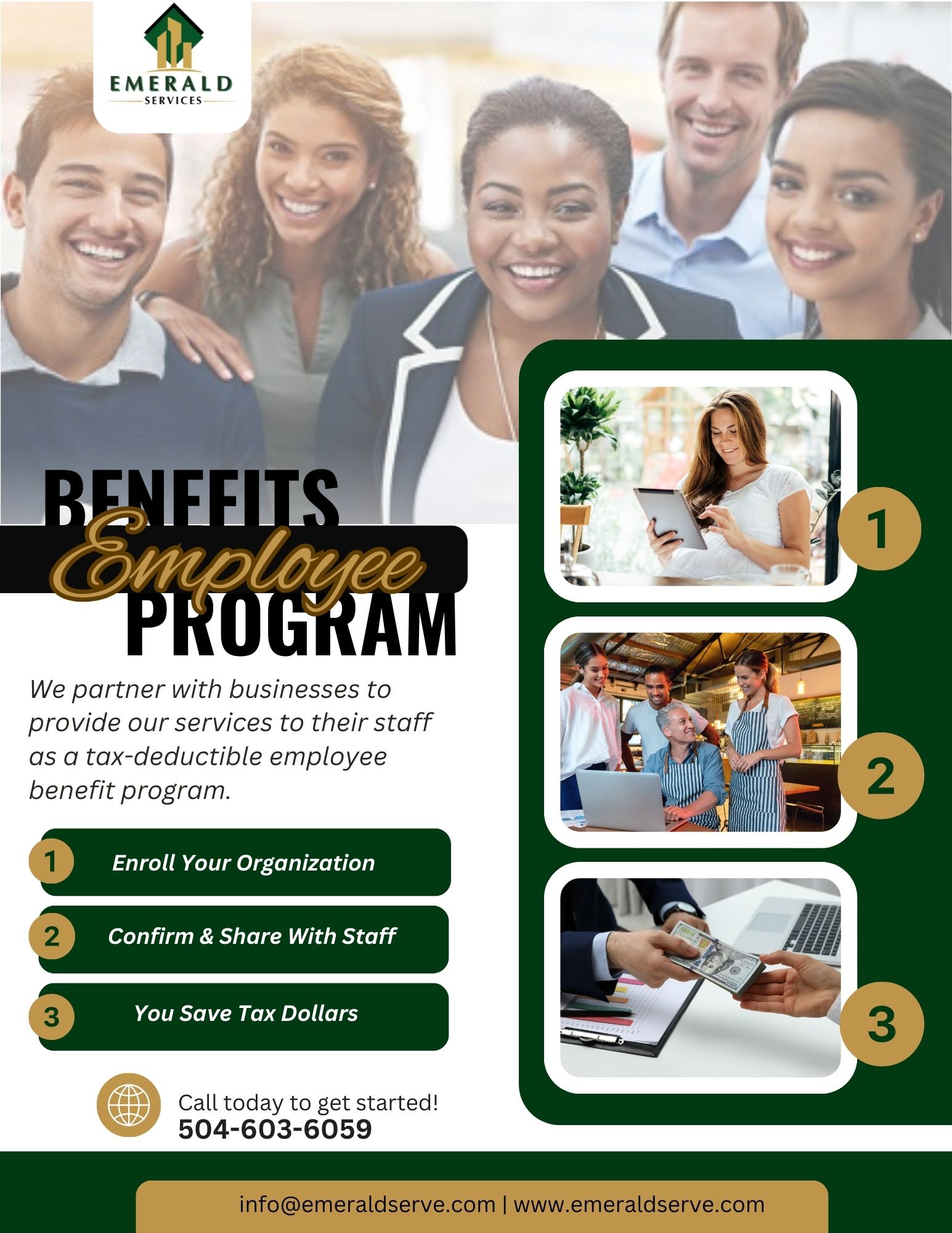 At Emerald Services, we understand that tax season is stressful—for both employees and employers. That’s why we created the Employee Benefits Program, a tax-saving solution that provides businesses with a valuable retention tool while giving employees the confidence and support they deserve.